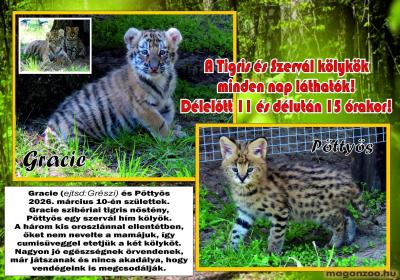 A kis tigris és a szervál kölyök minden nap etetési időben láthatók.